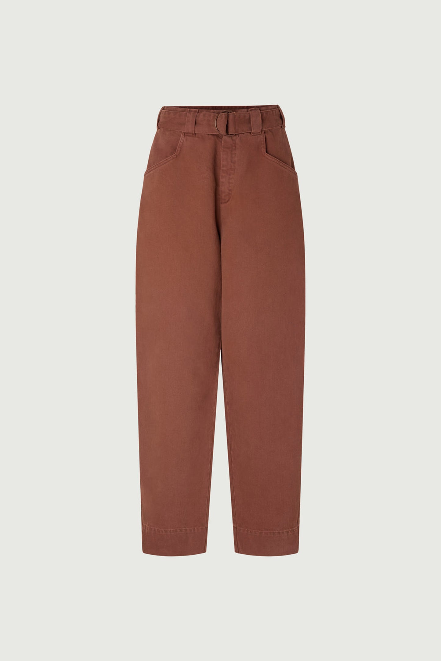 VOLAGE are high-waisted jeans adjustable with a wide slide belt. The thick cotton fabric emphasises its rounded volume. It's recognisable by its slanted-cut pockets. The legs are intentionally long to offer varied lengths and can be worn rolled up.
