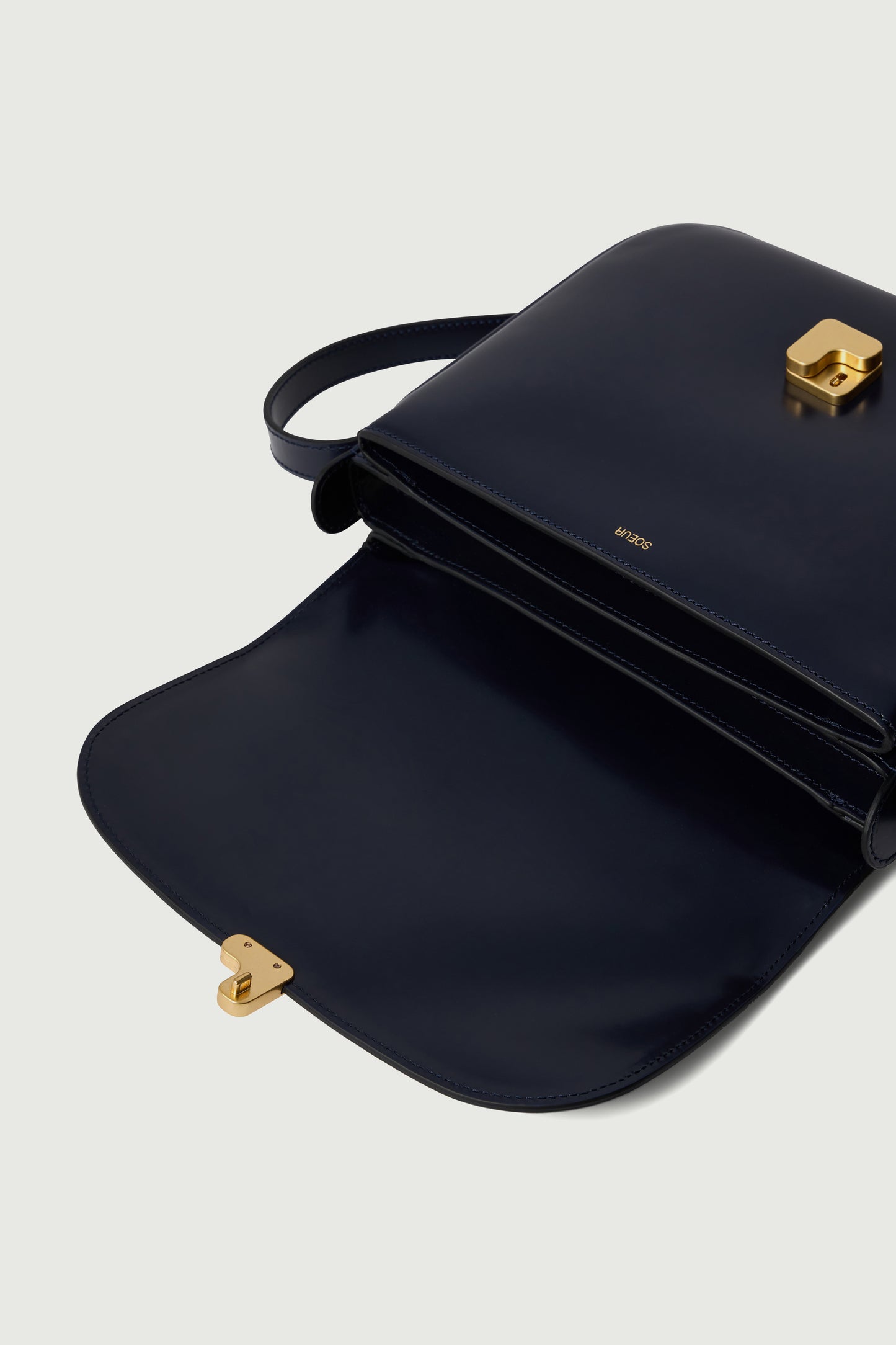 - Large front flap with golden "S" monogrammed clasp